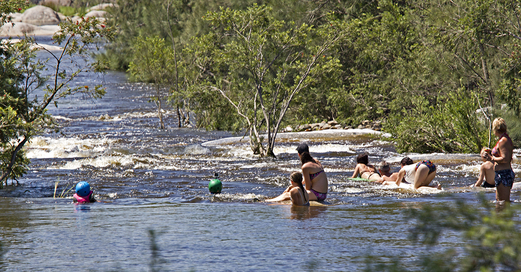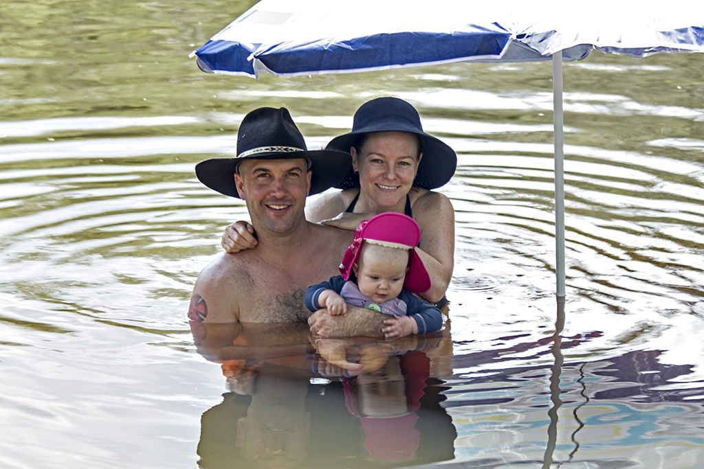 Woke to very dark clouds all around the hills, but wasn’t long and they had burnt off to a very warm day. We had breakfast, cleaned up and then did our walk, if you are not back from the walk before 8.30 am it’s just far too hot for me. The family next to us were having great fun going over the Rapids so Don and I started taking pics of them and did a video. I went over and told them and said I’d like to email them to them as i don’t want them. Harvey took me on the buggy down to the bottom of the rapids so I could do a video of them coming towards me. Then in the late afternoon Harvey took Don up the hills in buggy, I chose not to go as a bit rough on my back. We must of had 6 swims today. Kay and Mark came up for a swim in our waterhole as it’s in shade, their’s is in sun, not good for Mark. Sat around the fire for awhile and got all our scrapes burnt then bed.