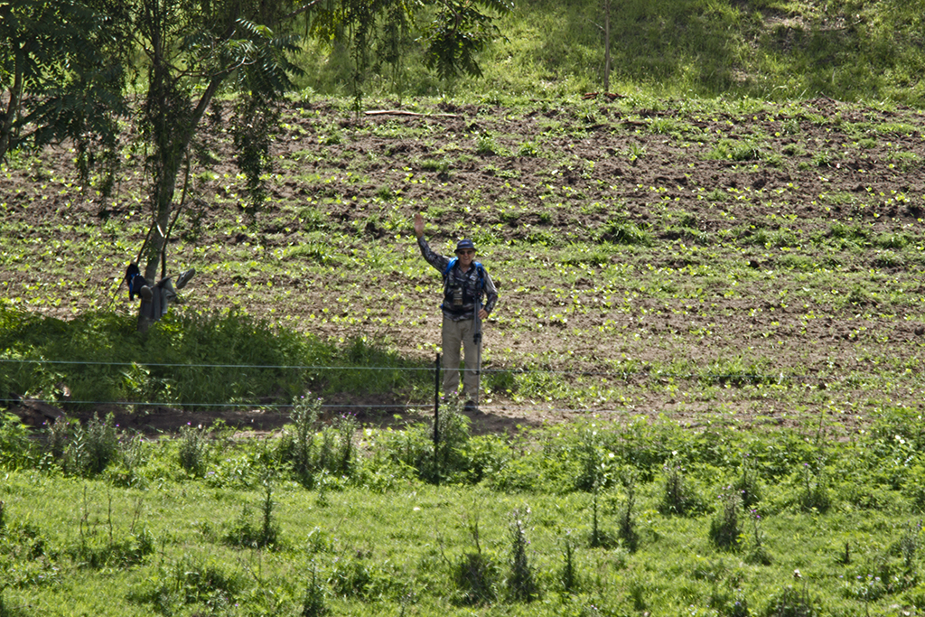 Don heading off on a hike up into the hills, keeping his clothes dry until he gets over the other side.