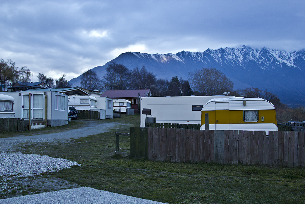 Frankton, at the caravan park just out of Queenstown on the shores of Lake Wakatipu. Very old but clean and tidy, nice place to stay, was a reasonable cost. The Remarkables in the back ground.