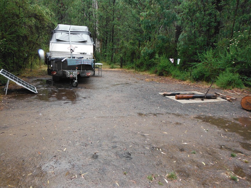 Up and away by 9 am and 14 degrees. Got to Yea and headed for King Parrot Creek, neither of us liked it so went back to Yea to the info centre. They were very helpful and suggested Murrindindi State Forest, so we got there and its lovely, we took the Water Gauge camp area. Lovely big sites, dug in and concreted fire pits, very safe. This whole area was burnt out 8 years ago. Can still see the devastation.