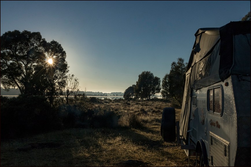 Woke to very clear skies, going to be a hot one, waiting for breakfast to settle then walk. Got short way and had to retreat back to the loo. So stayed home and did all my Qigong and Tai Chi. Took morning tea up to Kays and then decided we’d take the drive up the Wier and dam area, 28km up from our camp spot, taking the upper rocky river rd. Just beautiful scenery, large rocks and the river goes all the way, crossed over a wee bridge and people were camping there. Got to a area in shade for lunch then had a swim in the river there, not deep but cooling. Met Kay and Mark at the top of the range on our way home. Got back and took the mileage from where we walk to the camper was exactly 1 km so 2km return everyday we have done it. One morning was too wet. Doing a fire soon to do my bread and roast veggies for tea, will have a glass of my wine that I didn’t have for birthday. Lovely fine day, 33 deg and clouds building again, seems to happen each night but so far so good, making the most of it. Asked Duck about the story for my painting Bruce did for me as Bruce has gone into town, means Dolphin dreaming. He dreams of the mullet and when the fisherman come and take to many he splits them up so some left for him. Other two brothers have gone to town. Went to Kay and marks for a drink and we stayed awhile then came over to Harveys and Diannes group watched their fireworks, really lovely. Came home and sat listening to their music for awhile. Went to bed, the music did not stop until 2 pm. Great day.