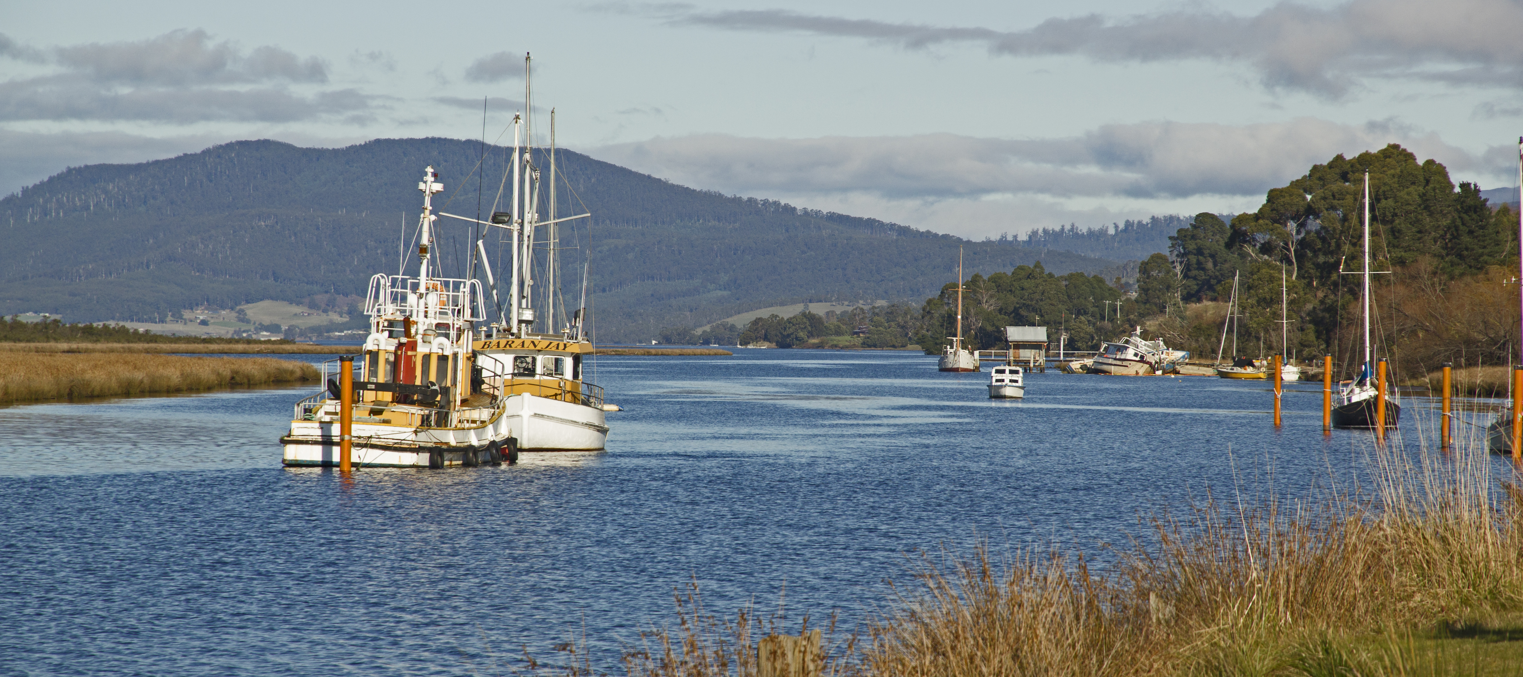 IMG_2907  Bridge over the Derwent River in Hobart.IMG_2908  The bridge in Hobart with Mt Wellington in back ground.IMG_2910  Mt Wellington.IMG_2914  Out of the traffic, now for some scenery.IMG_2920  This is where we had morning tea at Franklin on the edge of the Huon River.IMG_2928  A lot of old buildings are being used today for shops, galleries, etc, I loved the wheel in this photo.IMG_2931  Huon River.IMG_2932  As soon as I got over to the picnic table these ducks all came running, so funny.IMG_2937  Heading towards GeevestonIMG_2949  Free range chooks.IMG_2951  Nice entry to the town of Geeveston.IMG_2966  Had lunch at Dover.IMG_2972  Driving around to Southport, the end of the tar sealed road south.IMG_2982  Little beach holiday places right on the water.IMG_3001  End of the line. IMG_3017 IMG_3026  On our way back caught some good lighting on these yachts.IMG_3069 Another quick shot of the bridge at Hobart on our way home.