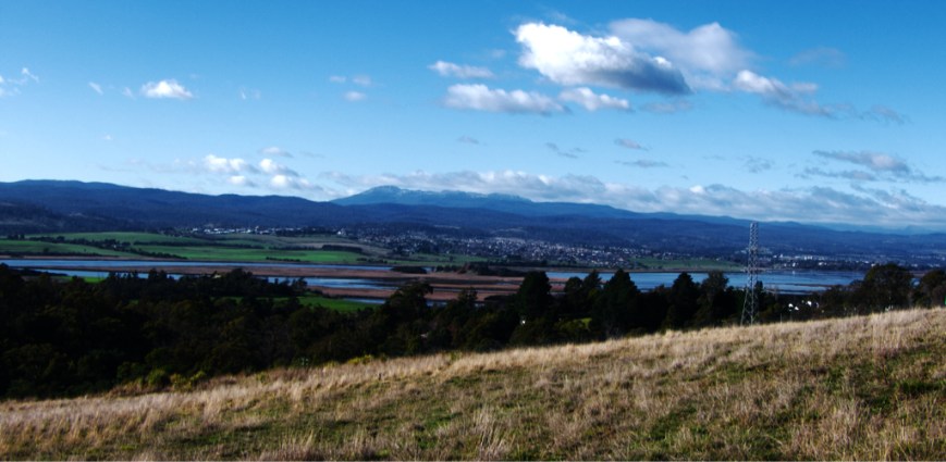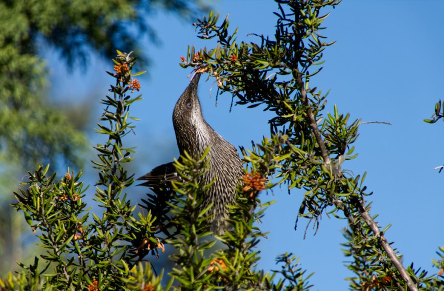 New Holland Honey Eater  Wattlebird  Bush Kitchen Views of Ben Lomond with a dusting of snow. Tamar river as well.