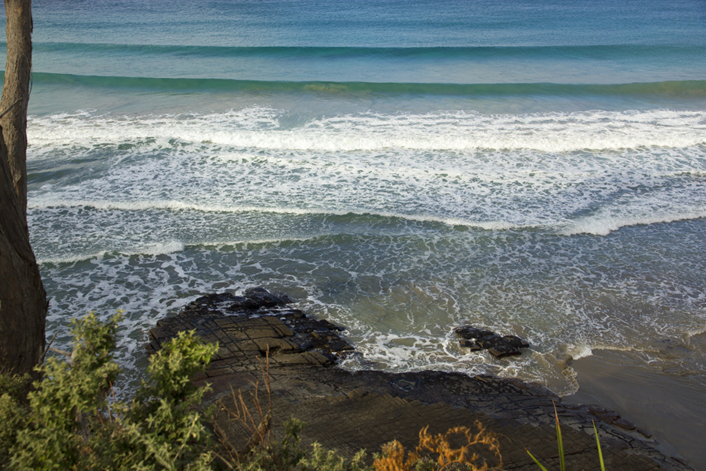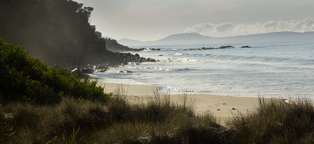 Sea spray, looking up towards the Freycinet national Park in the back ground.