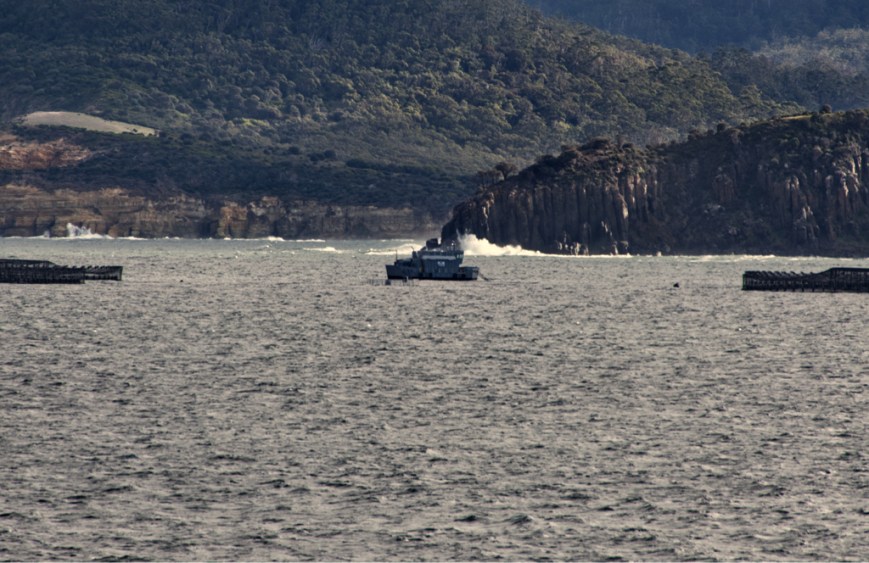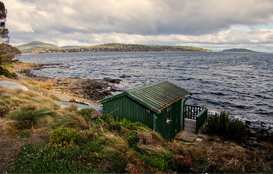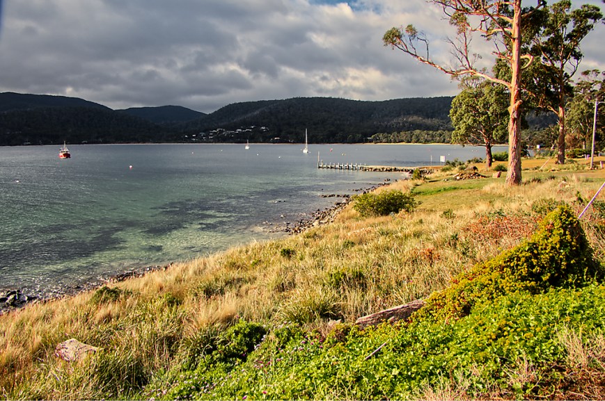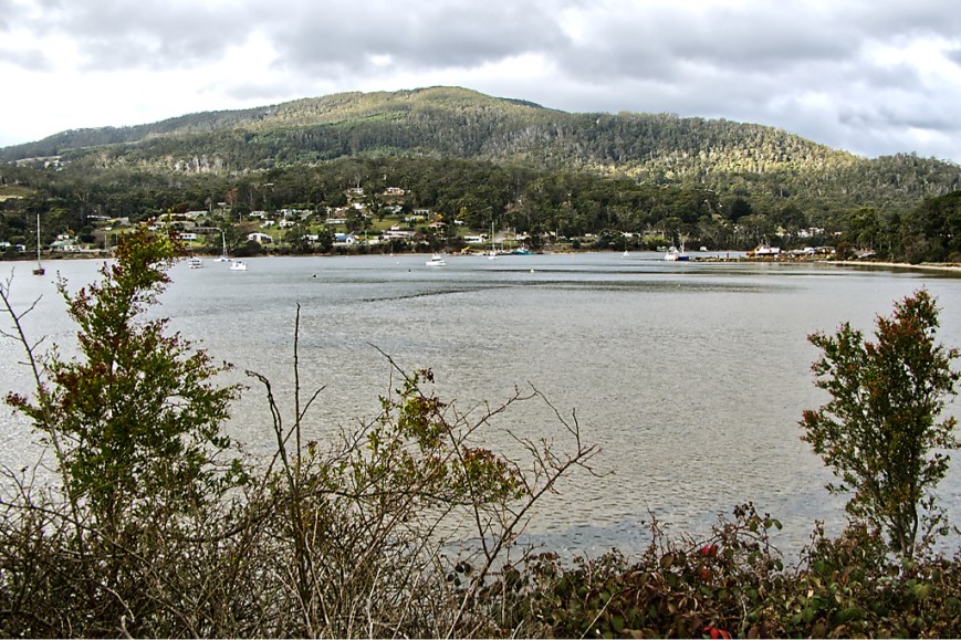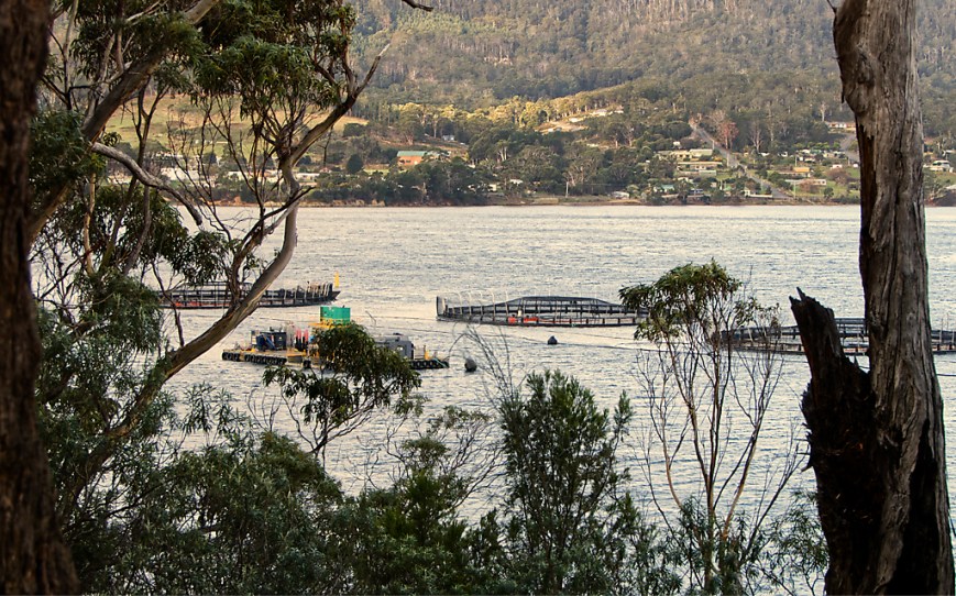 Looking across Wedge Bay towards Roaring Beach, you can see a part of the salmon ponds.